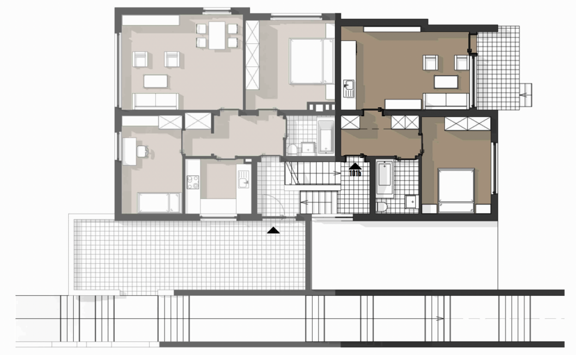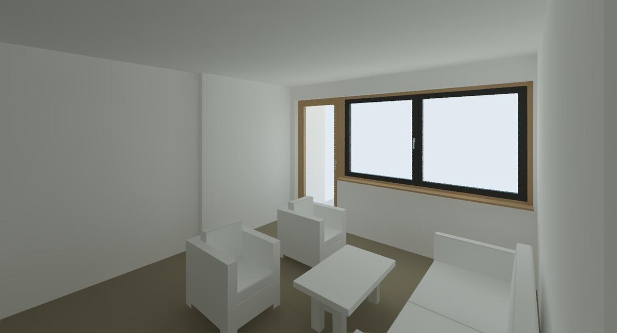 Die Wohnung verfügt über eine Wohnküche mit Balkon und direktem Terrassenzugang, ein Schlafzimmer, ein Badezimmer mit Dusche sowie einen Flur. Die Terrasse erweitert den Wohnraum nach außen und bietet Platz für Aufenthalt im Freien.